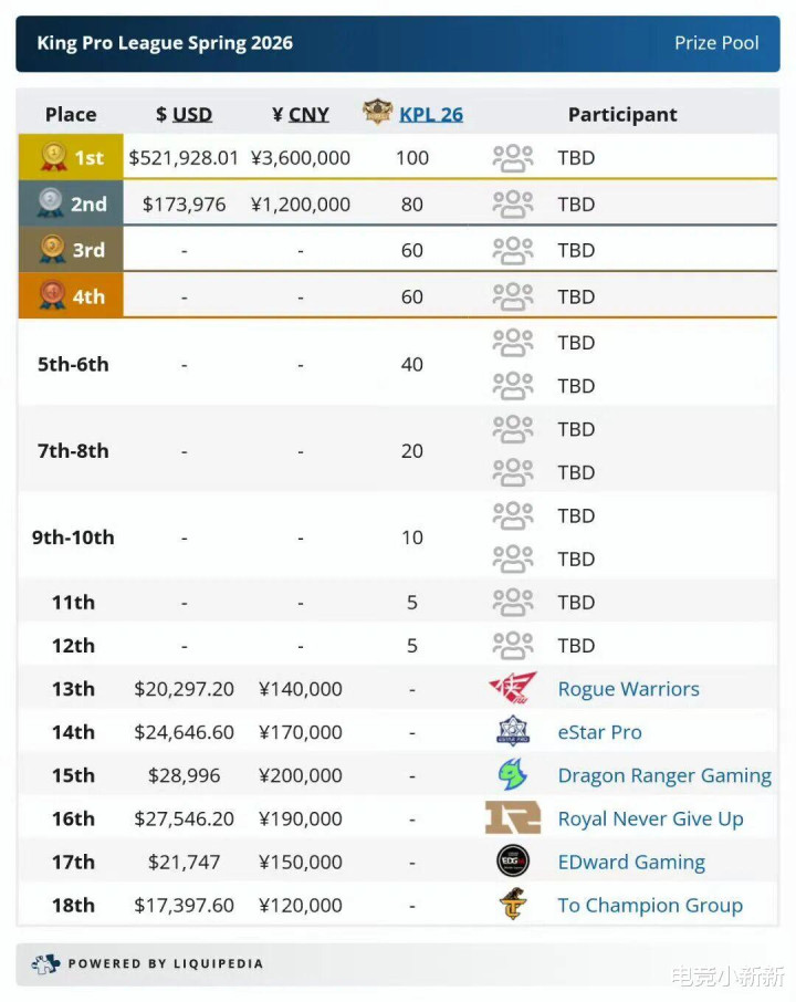 PS:RW拿了14万奖金、eStar拿了17万奖金、DRG拿了20万奖金、RNG拿了19万奖金、EDG拿了15万奖金、TCG拿了12万奖金,为什么DRG拿得最多,因为DRG小局打的比赛更多,而这个奖金是把柄每支战队小局数目算的,RW和TCG被零封的次数多奖金就很少。