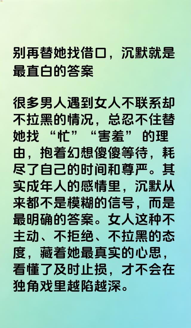 有东说念主说,女东说念主莫得谈判你,也从不拉黑你,反而像个“消散的淑女”,其实还是告诉你谜底了:她真不在乎。