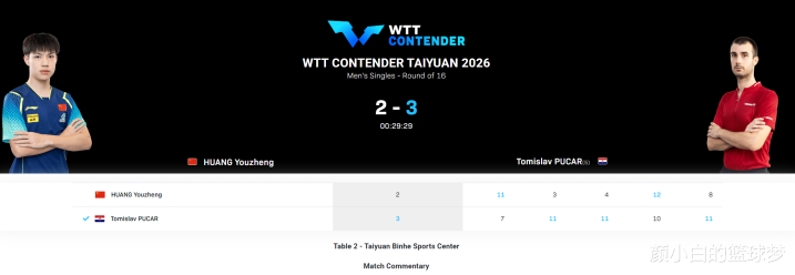 20岁的黄友政是第十五届全运会男团冠军,这位来自北京队的超等新星在太原站被交付厚望,没念念到他在首轮3-2淘汰日乒吉山瞭一后,在次轮2-3不敌普卡。