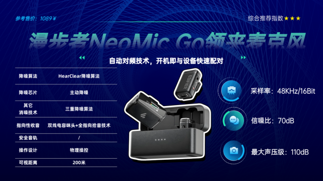 放射器降噪关闭时续航约8小时,开启降噪约7小时,接受器续航约6.5小时,充电盒可复充约2次;传输距离可达240米,视野范畴内相接谨慎,复杂环境下抗滋扰才略一般。