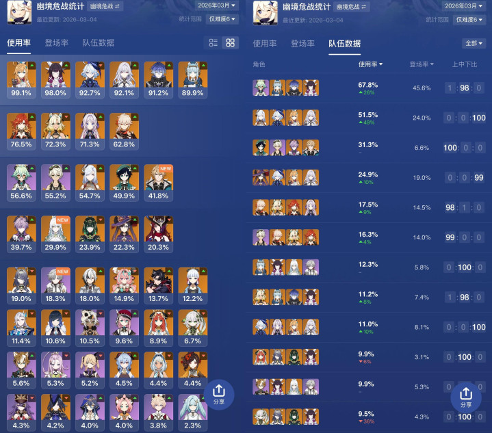 另外即是本期危战在小黑盒上的数据也在刚刚被统计了出来,质疑大团长的可以绝抵消停了!法尔伽在靠近风评欠安+小黑盒男变装buff的情况下,能在难度6领有41.8%的使用率以及名规律三的队伍,真是很可以了。