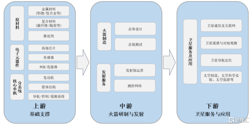 输送火箭制造位于买卖航天产业链的核心,其核心职能是将上游多如牛毛的原材料、元器件和分系统集成为一个玩忽可靠运行的举座。