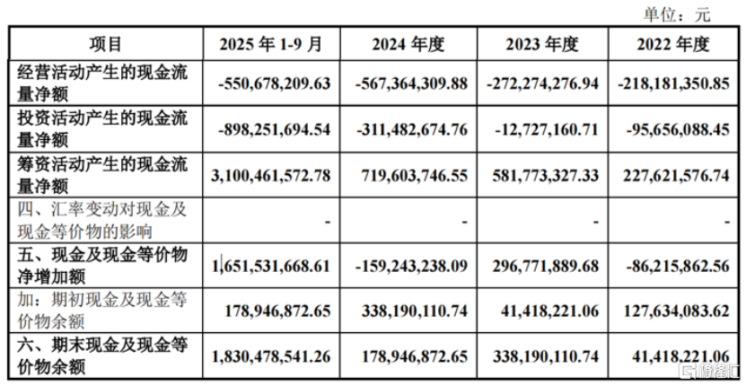 2022年、2023年、2024年及2025年1-9月(呈报期),公司的收入分别为595.29万元、7772.1万元、2.44亿元、8422.39万元,归母净利润分别为-17.61亿元、-5.12亿元、-8.61亿元和-7.49亿元,呈报期内累计升天38.83亿元。
