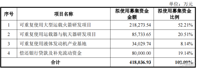 中科宇航这次策动募资41.8亿元,将用于可调换使用大型输送火箭研发表情、可调换使用输送器与航天器研发表情、可调换使用液体发动机产业基地、偿还银行贷款及补充流动资金。